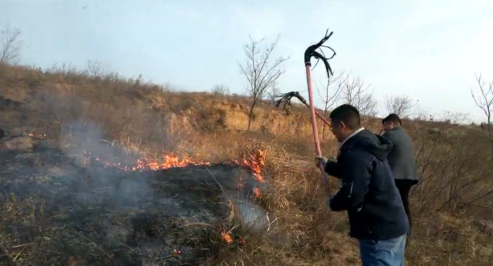 下午两点四十五分,运维人员后台巡视发现,梨园沟5-11、5-10光伏区东侧上坡有浓烟。我站运维人员迅速驱车前往巡查。到达现场时,因风势过大,火情已蔓延至防火围网附近,情况危急万分。运维人员和防火巡查员冒着被大火烧伤的危险奋力扑救。经过将近一个小时的奋战,明火全部被扑灭。最终,在运维人员的及时扑救下,在防火围网和防火隔离带的有效防范下,火灾未蔓延至光伏区,未造成光伏区内部着火,防火工作取得重大胜利。