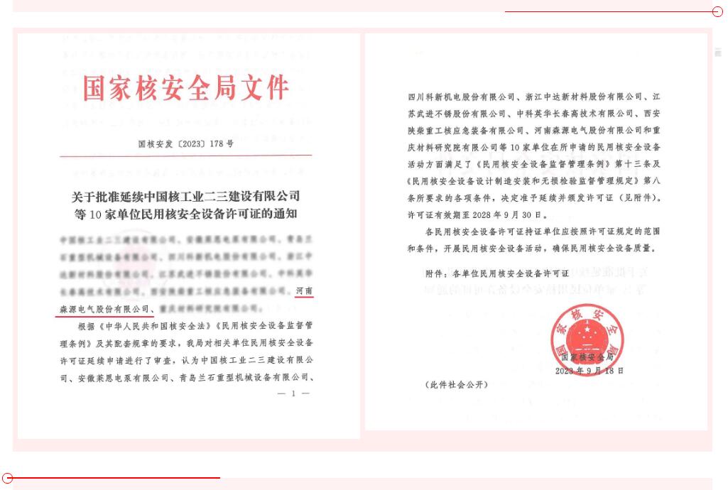 2018年10月,河南九游(中国)电气股份有限公司获得国家核安全局颁发《民用核安全设备设计许可证》及《民用核安全设备制造许可证》。期间我们参与了福建霞浦核电站、秦山核电站、山东海阳核电站等多个核电项目的建设,核电产品的设计质量、制造质量和服务质量得到客户的高度评价。五年后,国家核安全局经过严格的评审,批准延续我公司民用核安全设备设计和制造许可证。许可证有效期延续至2028年9月30日。