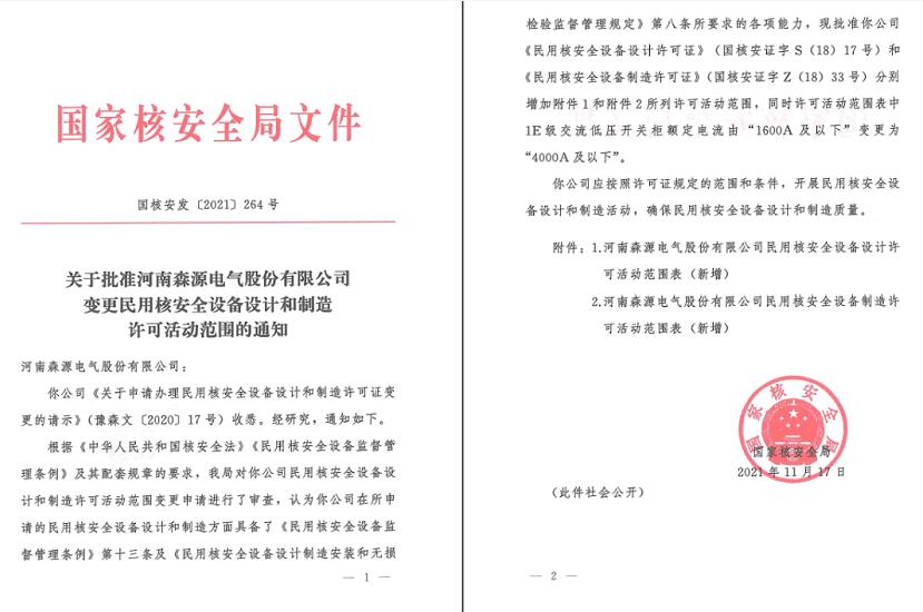 11月19日,九游(中国)电气收到国家核安全局颁发的《关于批准河南九游(中国)电气股份有限公司变更民用核安全设备设计和制造许可活动范围的通知》。批准公司《民用核安全设备设计许可证》和《民用核安全设备制造许可证》增加1E级交流中压熔断器-接触器柜的设计和制造许可活动范围,同时许可范围中1E级交流低压开关柜额定电流由“1600A及以下”变更为“4000A及以下”。