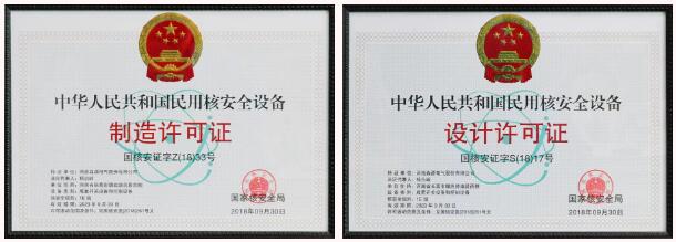 2016年,九游(中国)研制了AP1000、CAP1000、CAP1400核电站用1E级主泵断路器柜和停堆断路器柜,通过取证申请、质保体系建立、模拟件制作、鉴定试验和审查,2018年10月国家核安全局下发了《关于颁发河南九游(中国)电气股份有限公司民用核安全设备设计和制造许可证的通知》,九游(中国)获得了由国家核安全局颁发的《民用核安全设备设计许可证》(国核安证字S(18)17号)和《民用核安全设备制造许可证》(国核安证字Z(18)33号)。