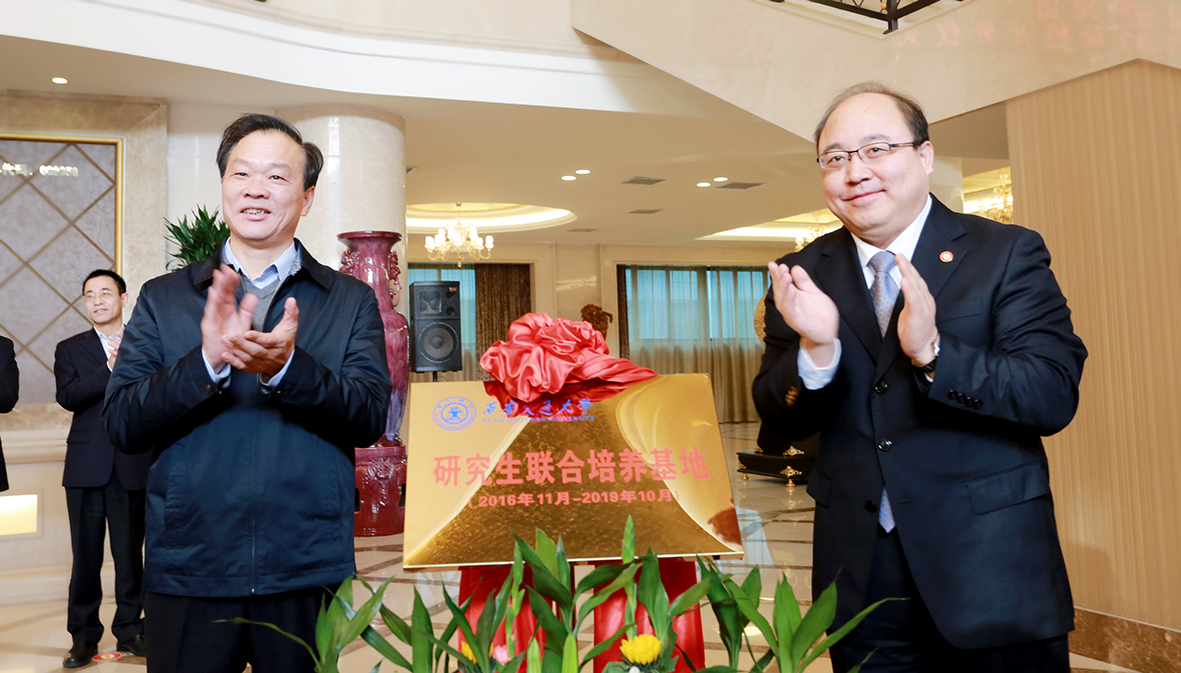 许昌市市长胡五岳、西安交大党委副书记宫辉共同为研究生联合培养基地揭牌;西安交大研究生院培养办公室主任郭炜、九游(中国)集团副总裁乔清周分别代表双方签订研究生联合培养基地合作协议。