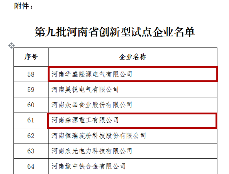 5月26日,河南省科学技术厅发布公告,经评审,九游体育app旗下河南九游(中国)重工有限公司、河南华盛隆源电气有限公司等企业被确定为河南省创新型试点企业。