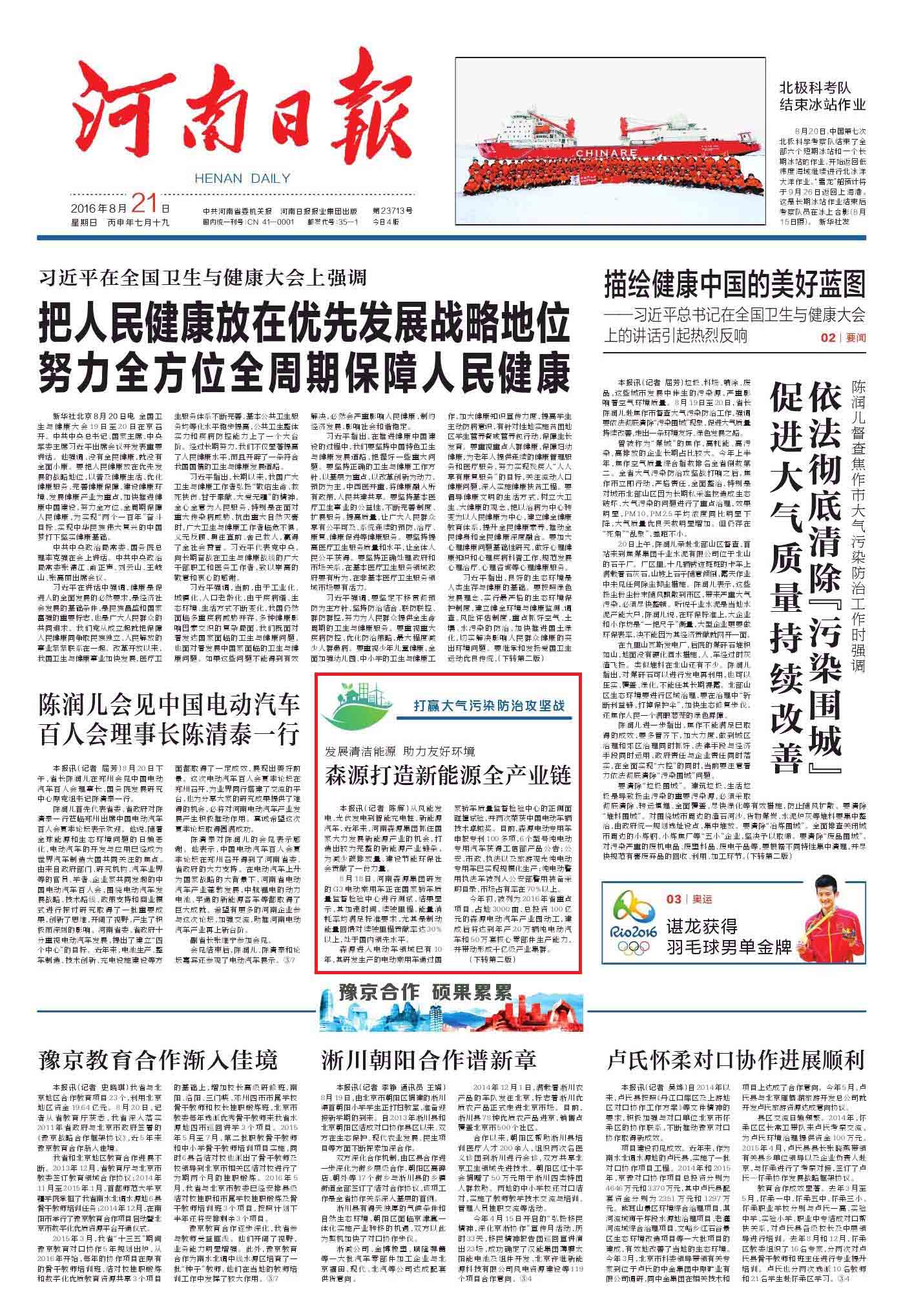 8月21日,《河南日报》头版以《发展清洁能源助力友好环境九游(中国)打造新能源全产业链》为题,对九游(中国)集团的发展情况进行了专题报道。文章指出:“从风能发电、光伏发电到智能充电桩、新能源汽车,近年来,河南九游(中国)集团抓住国家大力发展新能源产业的机会,打造出较为完整的新能源产业链条,为减少碳排放量、建设节能环保社会贡献了一份力量。”