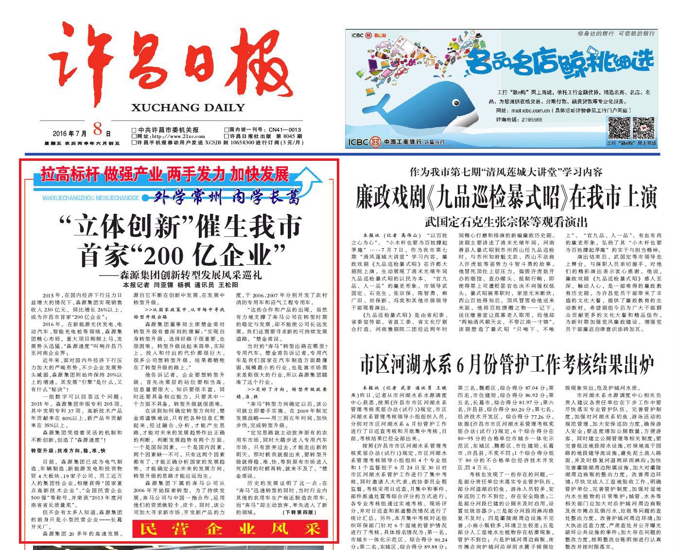许昌日报头版报道——“立体创新”催生我市 首家“200亿企业”