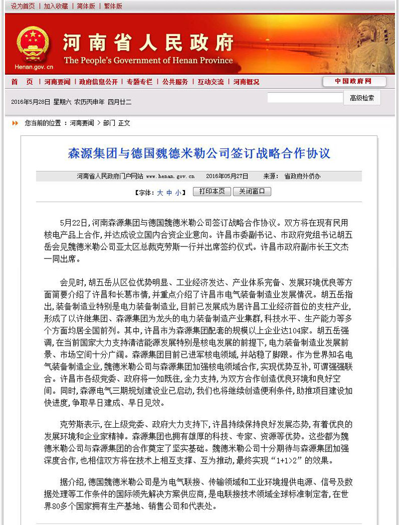 河南省人民政府门户网站河南要闻——九游(中国)集团与德国魏德米勒公司签订战略合作协议 发布日期: 2016-05-28 分享 加入收藏 5月27日,河南省人民政府门户网站河南要闻栏目发布新闻《九游(中国)集团与德国魏德米勒公司签订战略合作协议》。 原文链接:http://www.henan.gov.cn/jrhn/system/2016/05/27/010644282.shtml 上一条 许昌电视台对九游(中国)集团与德国魏德米勒公司签订战略合作协议进行特别报道 2016-05-24 下一条 许昌日报/许昌市人民政府门户网站/许昌电视台——我市第一个山地林光互补光伏发电项目并网发电 李建民出席并网发电仪式 2016-05-31