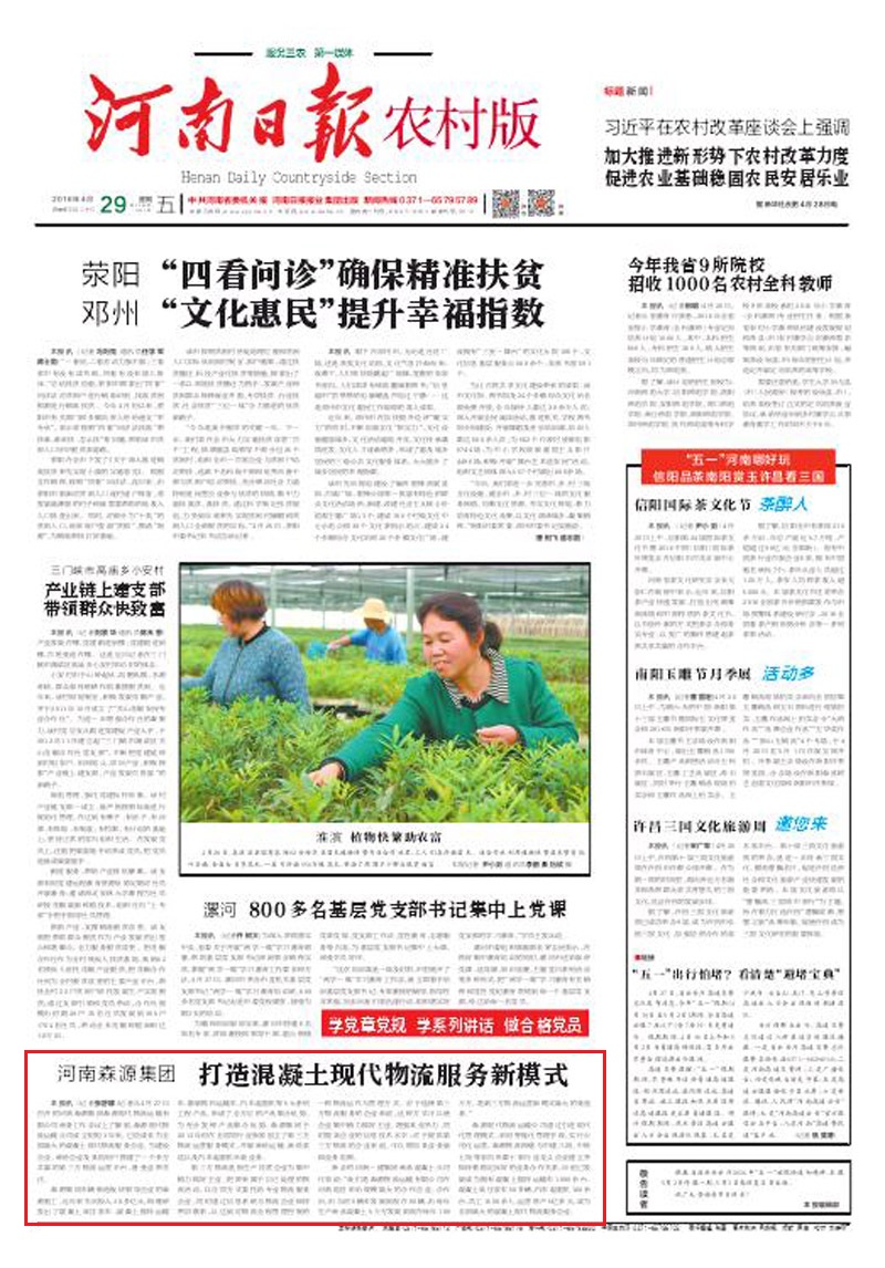 河南日报头版报道——河南九游(中国)集团打造混凝土现代物流服务新模式